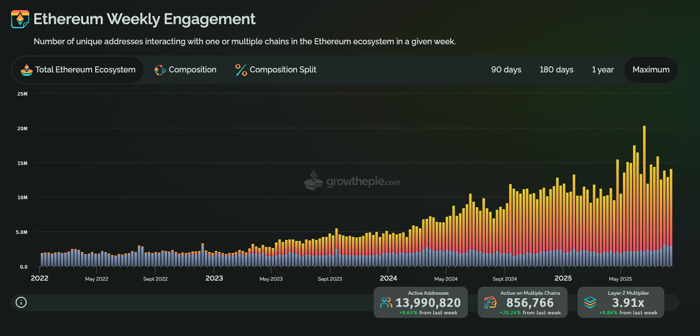 Number of unique addresses interacting with one or multiple Layer 2s weekly.