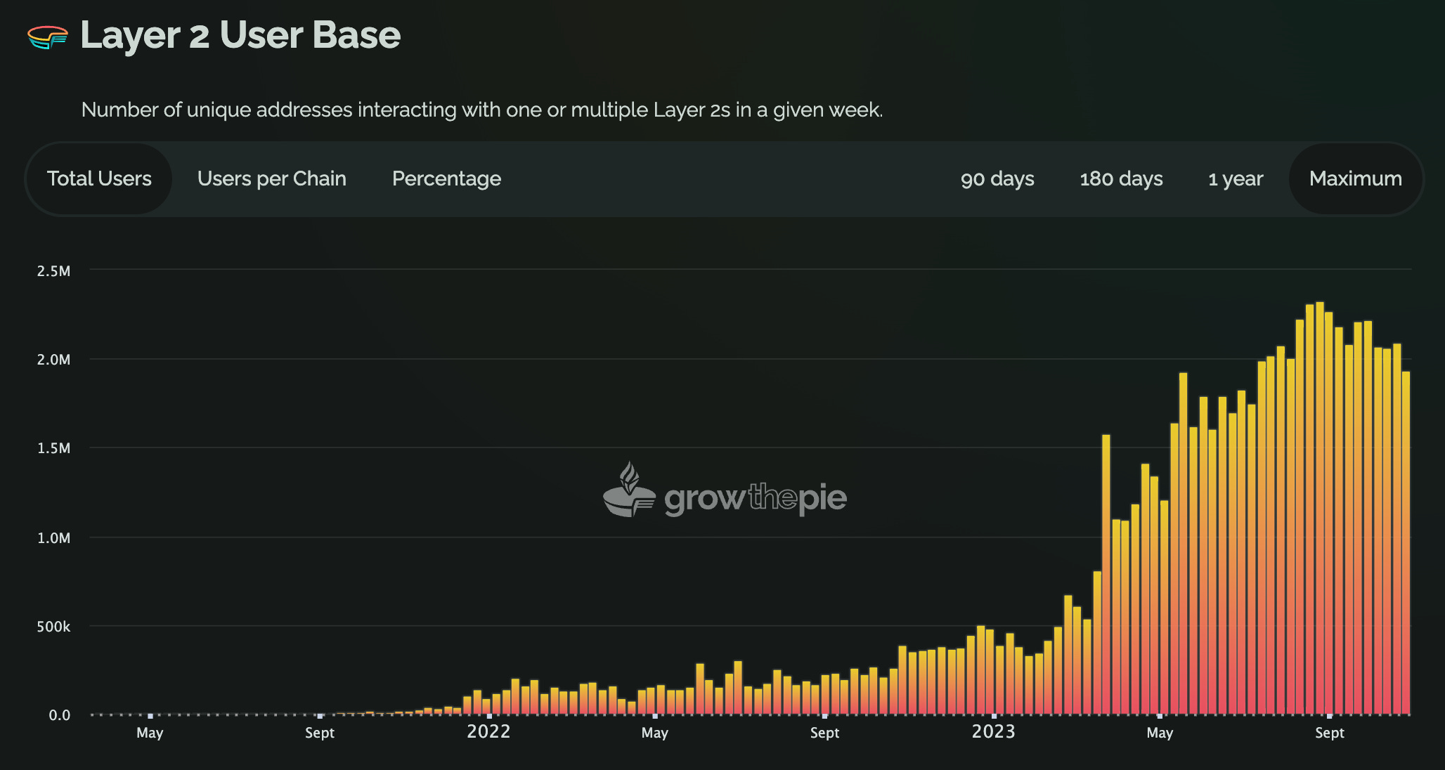 Number of unique addresses interacting with one or multiple Layer 2s weekly.