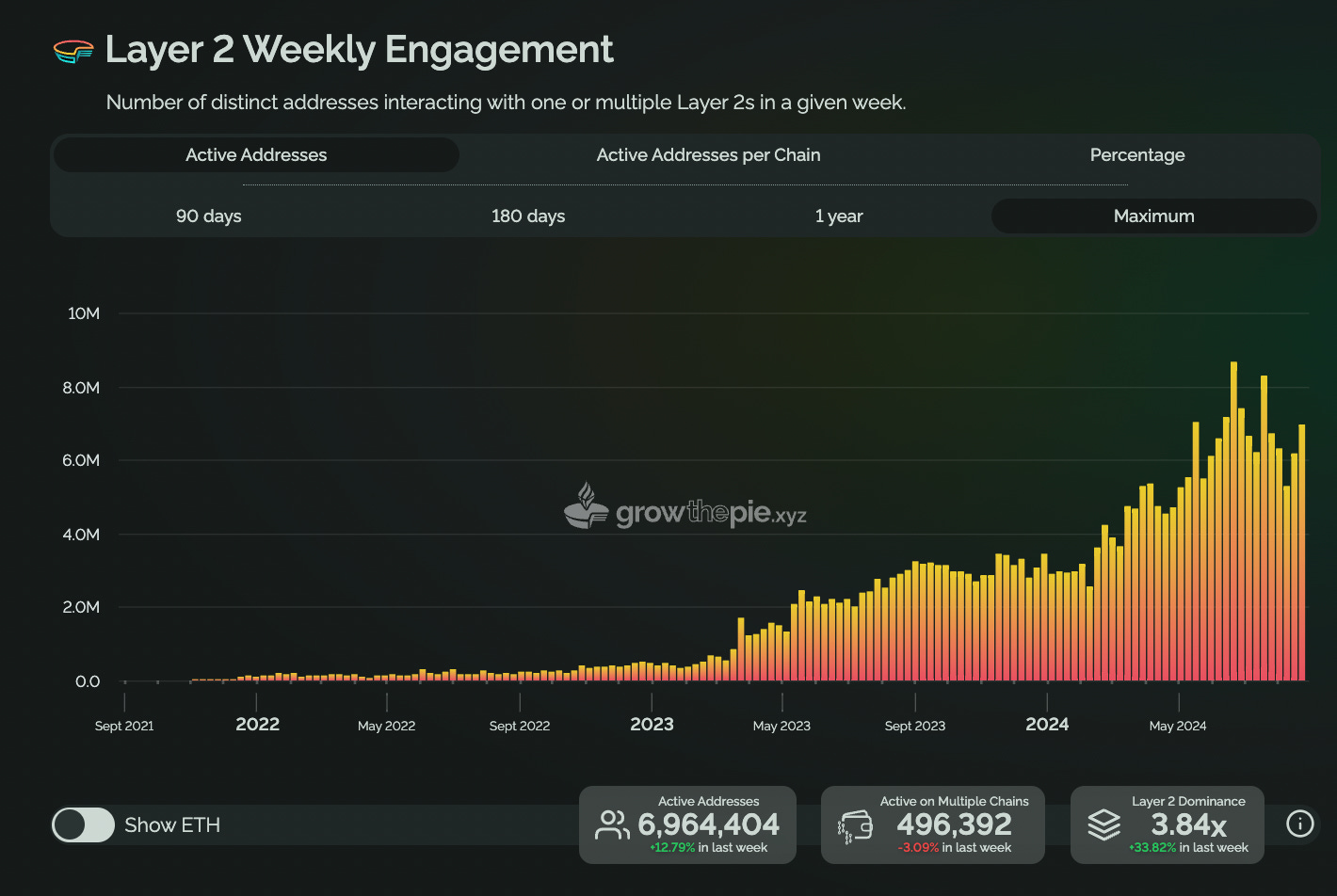 Number of unique addresses interacting with one or multiple Layer 2s weekly.