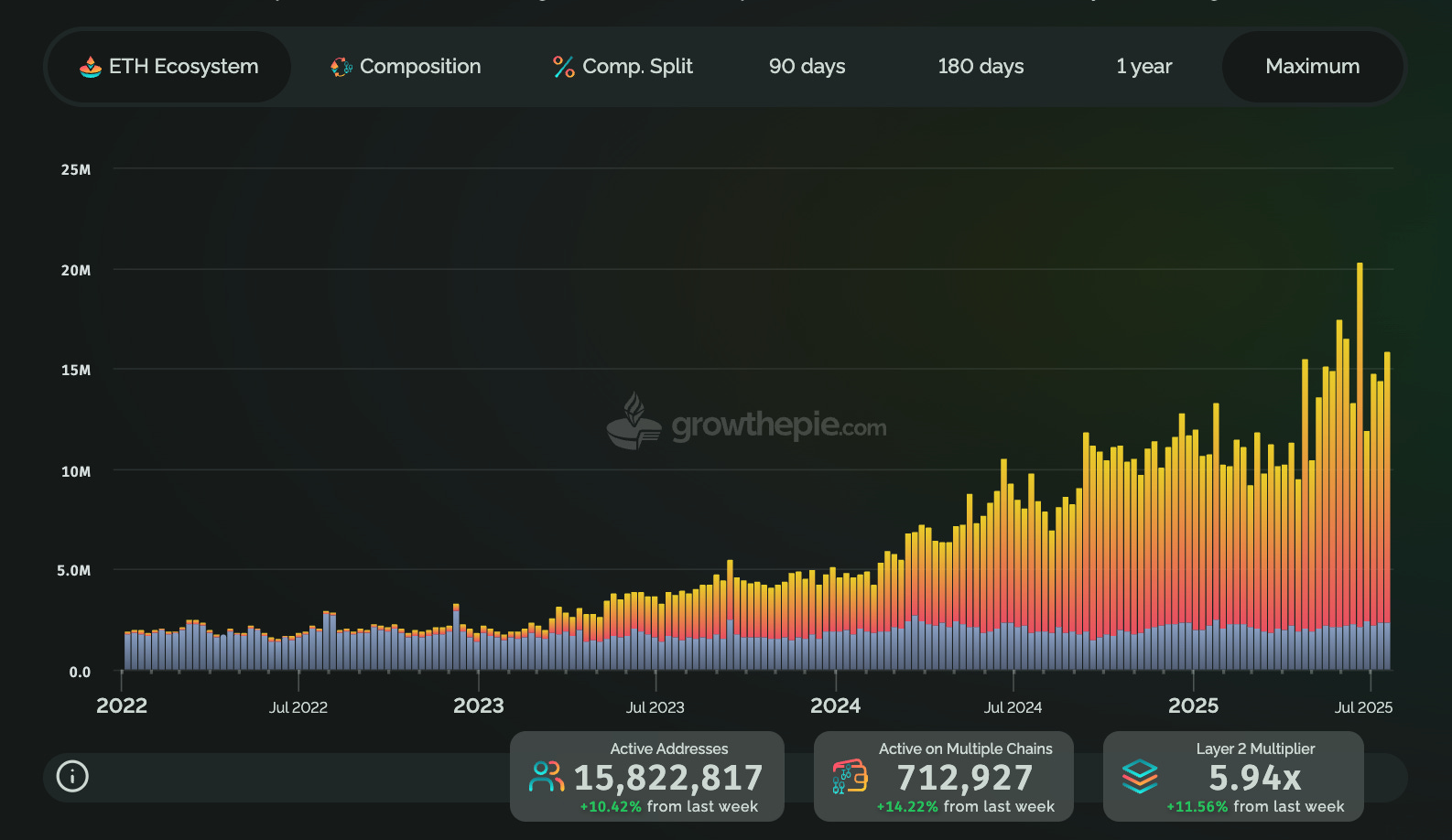 Number of unique addresses interacting with one or multiple Layer 2s weekly.