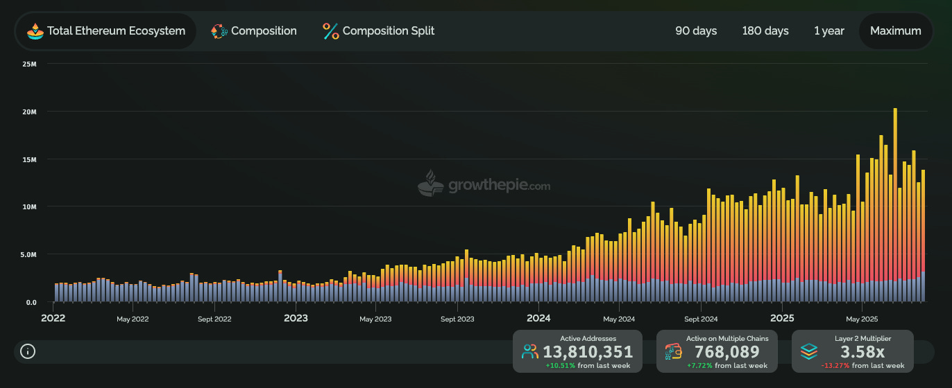 Number of unique addresses interacting with one or multiple Layer 2s weekly.